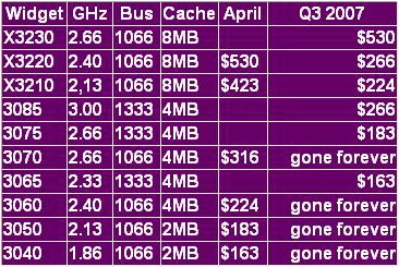 Intel将在第三季度推出主频2.66GHz,1066MHz系统总线,8MB缓存的X3230,在同一时期发布的还有1333系统总线的双核SKUs。
