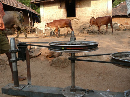 通过一台菲亚特汽车取下的发动机,外加一些轮子和带子便组成了一个发电系统,但还差发动这一步,于是牛这时起到了关键的作用。OLPC方面计划用牛来拉发动机进行供电,与中国农村里的驴推磨有异曲同工之妙。