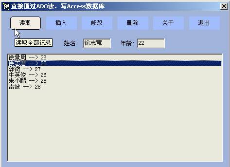 ADO提供了一组非常简单,将一般通用的数据访问细节进行封装的对象。由于ODBC数据源也提供了一般的OLE DB Privider,所以ADO不仅可以应用自身的OLE DB Privider,而且还可以应用所有的ODBC驱动程序。关于OLE DB和ADO的其它详细情况,读者可以自行查阅相关书籍或MSDN,这里就不一一说明了。让我们直接步入主题,如何掌握ADO这种数据库访问技术ADO的操作方法和前面讲过的DAO的操作在很多方面存在相似之处,在这里,笔者为了更有效的说明它的使用方法,用VC6.0做了一个示例程序(AdoRWAccess),这个示例程序可以直接通过ADO来操作Access数据库,示例程序的运行效果如下图所示: