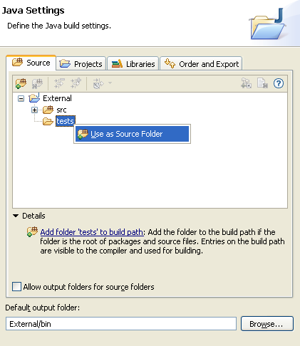 新的Java项目向导中增强的源代码文件夹页面:在Java项目创建向导中的一个增强的源代码文件夹配置页面能够帮助你从已有源代码创建项目。你能够定义源代码文件夹的入口、直接在树型结构中指定include/exclude文件夹,并进行立即测试所做改变。