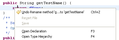 编辑菜单中含有重构Undo/Redo:原先在菜单条中的重构Undo/Redo已经消失,取而代之的是在编辑菜单中将Java编辑器的Undo/Redo操作与重构的Undo/Redo操作集成。现在如果要进行重构的Undo只需要使用快捷键Ctrl+Z。