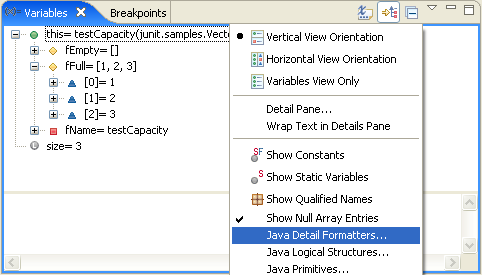 1.toString( )方法计算的变量的值能够在变量视图树型结构中显示。此视图菜单中的Java Detail Formatters... 命令用来对其进行配置。