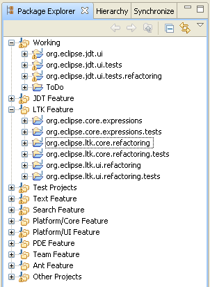 使用多个项目组织工作区:在Package Explorer的视图按钮中使用 Show > Working Sets 启用将工作集作为顶层元素显示的模式。这种方式使管理包含多个工程的工作区更加容易。