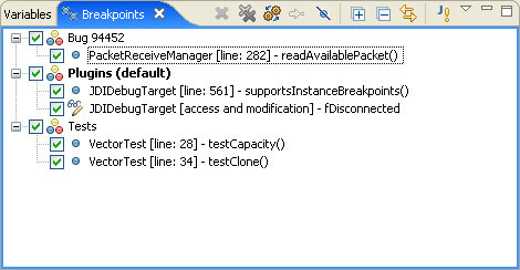 断点组织:断点视图允许断点以类型、工程、文件或者工作集的方式组成,并支持内嵌组。