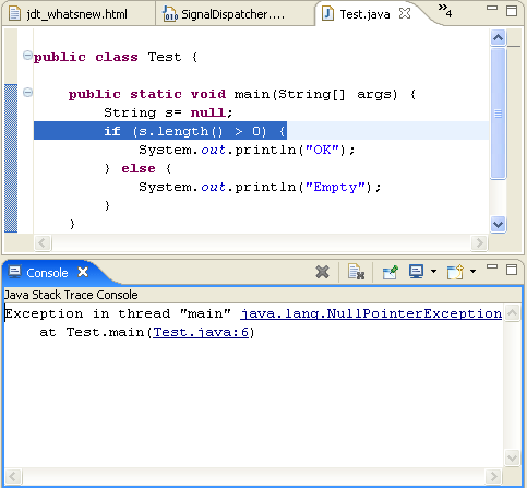 浏览栈轨迹:拷贝并粘贴栈轨迹到Java栈控制台中,并使用超链接来浏览栈轨迹。Java栈控制台能够从控制台视图中的Open Console 下拉按钮中选择。粘贴的栈轨迹能够通过标准的 Format 键格式化。