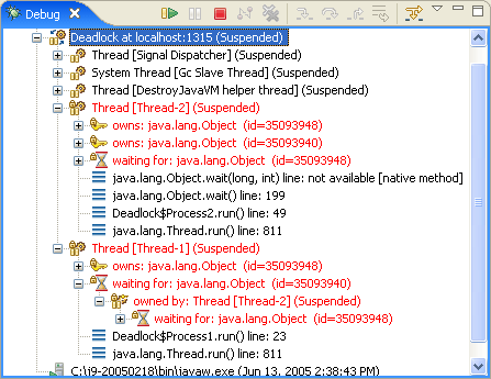 调试锁和死锁:当在调试视图的下拉按钮里面选择Show Monitors 按钮,这可以查看一个线程所拥有的锁和等待锁定的一个线程。线程和死锁都用高亮红色显示: