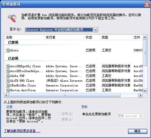 如果你的Windows XP系统已经安装了SP2补丁包,那么IE浏览器中就内置了ActiveX插件管理功能,利用它可以对已存在的插件进行管理。
