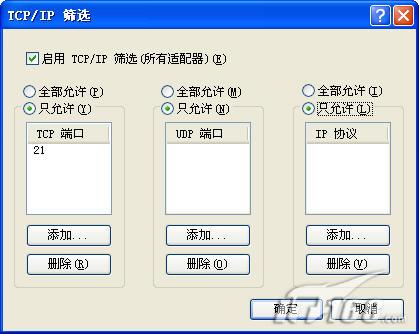 2.“TCP/IP筛选”功能。依次进入“本地连接”---“常规”---“Internet协议(TCP/IP)”,然后双击打开,再点“高级”按钮,切换到“选项”即可开始设置。如下图所示,这里我们可以设置系统只允许开放的端口,这种筛选设置可以有效防止最常见的如139端口的入侵,但该方法缺点同样明显:功能过于简单,只能设置允许开放的端口,不能自定义要关闭的端口,如需开放多个端口还要一一手工添加,比较麻烦。