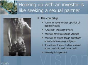 有个老外做了一个ppt,标题是“Sex & the Investor”,我把这个翻译成“找vc投资和找小姐的共同特点”,非常搞笑,给创业者分享一下,难道找vc和找小姐真的是一样一样的?纯粹给大家搞笑一下,在中国做vc的人不要生气哟!美国的vc好像名声不怎样呀,中国的vc名头可是如日中天呀!