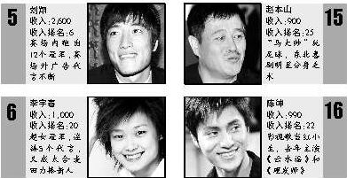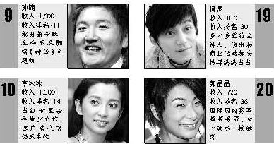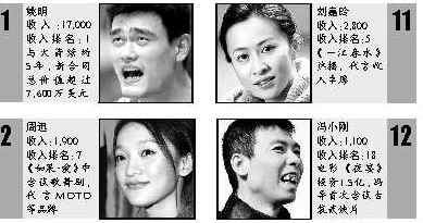2006福布斯“中国名人榜”里,姚明连续两年蝉联综合排名和年收入排名第一的位置,而且今年他的收入比去年多了2000万元,升到1.7亿元。去年的亚军章子怡微跌一级成了季军,亚军的位置被周迅取代。她凭借《如果·爱》得到了高曝光率并赚到1900万元。