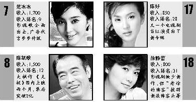 榜单解读:“老徐”博客赚人气不赚钱去年的福布斯排行榜上,王菲和李亚鹏还分列第5和第56,收入分别为2200万元和350万元人民币。但今年的名人榜上,两人100强却不入。其实去年媒体围着两人结婚生子“转”足一年,理应可以上榜,为何双双落选呢?至于徐静蕾近期可谓风光无限,凭借徐博客突破千万的点击率,以及在博客上与韩寒调情等绯闻,频频赢得高曝光率。无奈心思花在了博客上,影视剧缺少新作,徐静蕾综合排名仅列第18位,收入也只有800万元。