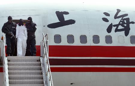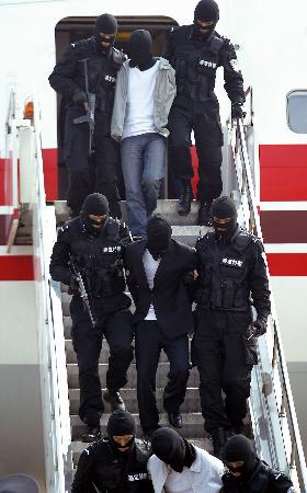 3月10日,特警将犯罪嫌疑人押下飞机 新华社发赵昀摄