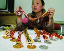 邹春兰正摆弄以前她比赛赢得的奖牌,其中有四枚是金牌