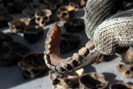 专家鉴定:全部是人头这些头骨骷髅到底是猴子的还是人的?3月31日下午6时,当地警方派出专门办案人员专程将部分头骨骷髅送到了兰州大学生命科学院进行鉴定。该学院刘教授在仔细观察实物后很快得出结论:这些头骨骷髅不是猴子的,的的确确就是现代人类。