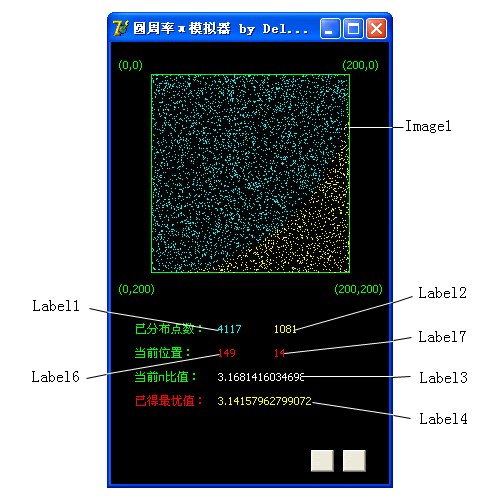 最后加入两个SpeedButton作为开始和暂停按钮,代码分别是Timer1.Enabled:=true;和Timer1.Enabled:=false;。好了,程序这样就完成了,赶快按下F9亲自模拟一下π的计算吧!
