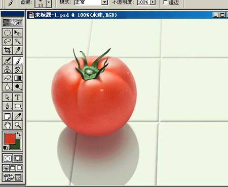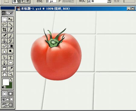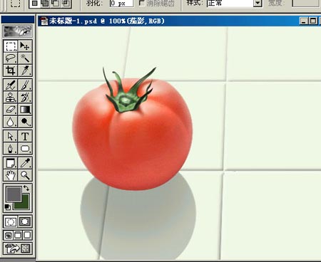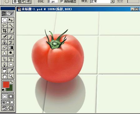 19.蕃茄在瓷砖上会映出轻微红色,在茄影上新建一层,画个椭圆,羽化后填充红色,如果觉得过渡不够柔和就用高斯模糊。混合模式也是“正片叠底”,不透明度为70%。