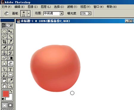 6.蕃茄有几个瓣,现在来做这几条陷下去的纹。画个椭圆,用选择-变换选区旋转和移动到适合的位置,羽化1,在凹纹的位置用减淡工具檫。