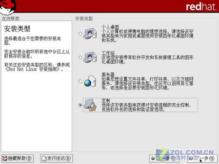 选择安装类型*********如图7所示******,Red Hat提供了三种不同类型的软件包套件,个人桌面,工作站和服务器。可以根据自己的需要选择不同的安装类型。这里我们选择“定制”。