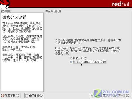 选择“用 Disk Druid 手工分区”,单击“下一步”
