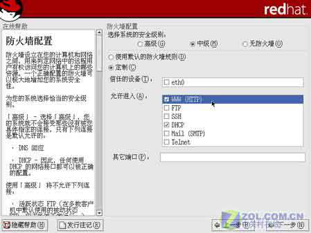 防火墙配置*******如图15所示******。Red Hat提供了三种安全级别的防火墙配置,可以根据自己的需要进行选择。如果作为服务器,那么需要打开提供服务使用的端口。