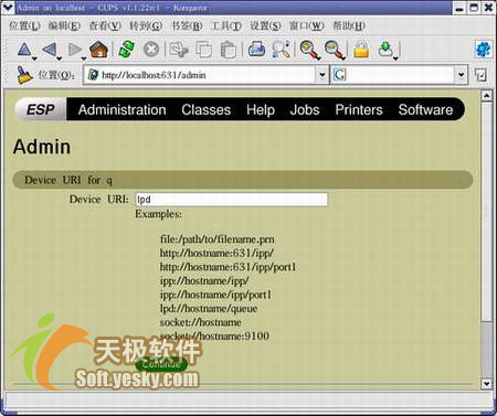 填写完以上信息后,点击"Continue"键。接下来的页面询问打印机当前使用什么类型的设备。唯一的选项是:Disk File。所以用户只要选择"Continue"就可以了。接着用户要提供设备的URI。包括: http://hostname:631/ipp/port1