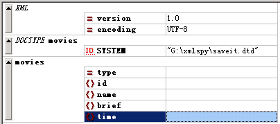 3)建立子节点id,name,brief,time.在movies sequence of上点右键,选择Append->ELEMENT,增加四个节点,数据类型全部设为PCDATA.如图7所示。这样DTD文档就建立好了。命名为saveit.dtd保存到G:\\\\xmlspy目录下。在View->Text view方式下可以查看编辑所得到的源代码,选择View->Enhanced Grid view会回到树型编辑视图方式。