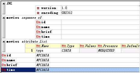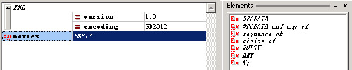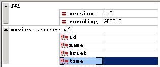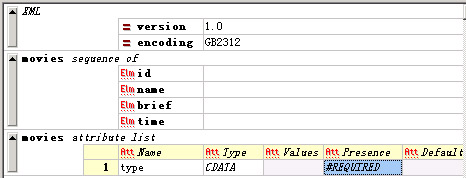 选择菜单File->New弹出Create new document 对话框,选择里面的dtd(Document Tpye Definition),这样一个空的DTD文档就会被建立在编辑区,如图1所示。点击左上角的黑三角会变成图2所示的样子。我们将编码方式项enconding默认值为UTF-8,我们将其改为GB2312.在Elm处双击,输入movies.完成后如图3所示。保持Elm movies的选中状态,双击右侧Elements框里的sequence of,结果如图4所示。这样根结点movies就建立完毕了。