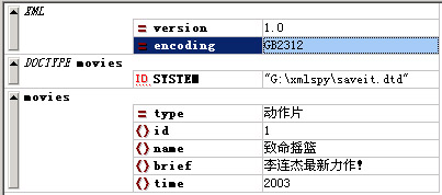 2)点击OK后XML Spy就会为我们自动建好符合saveit.dtd验证的XML空白文档。如图14所示。填入内容数据。将编码方式项enconding更改为GB2312.结果如图15所示。