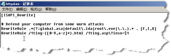 找到ISAPI_Rewrite目录,把httpd.ini的只读属性去掉,打开编辑.我们要把1ting.asp?inso=im286映射成为1ting-im286.html这样的类型,需要在httpd.ini里加上这么一行: