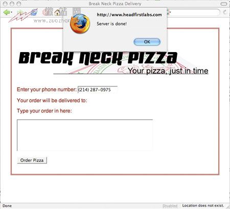 它仅仅发出一些简单的警告,告诉您服务器什么时候完成了任务。在自己的网页中试验这些代码,然后在浏览器中打开(如果希望查看该例中的 XHTML,请参阅 ** 8)。输入电话号码然后离开该字段,将看到一个弹出的警告窗口(如 图 3 所示),但是点击 OK 又出现了……