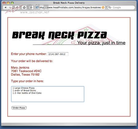 首先,得到 responseText 并使用 JavaScript split() 方法从管道符分开。得到的数组放到 response 中。数组中的第一个值 —— 上一个订单 —— 用 response[0] 访问,被设置为 ID 为 “order” 的字段的值。第二个值 response[1],即客户地址,则需要更多一点处理。因为地址中的行用一般的行分隔符(“\n”字符)分隔,代码中需要用 XHTML 风格的行分隔符 <br /> 来代替。替换过程使用 replace() 函数和正则表达式完成。最后,修改后的文本作为 HTML 表单 div 中的内部 HTML。结果就是表单突然用客户信息更新了,如图 4 所示。