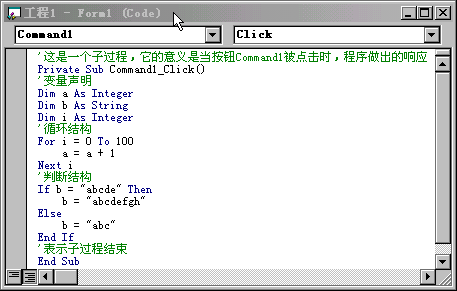 如果你还记得上节中的内容,我们提到过如果在“窗体设计区域”的某个组件(控件)上双击鼠标,会出现“代码编辑窗口”,也就是如下图的窗口,我们可以在其中输入或是修改程序的代码。在我们双击控件到写入代码的这个过程中,我们涉及到了一个很重要的概念,这是VB与QBASIC的主要差别之一,大家知道在QBASIC包括Tubro C,TubroPascal等语言中程序从一开始就需要我们一点点的写代码来实现所有的功能,比如程序运行的界面,输入输出,键盘控制等,它们在程序中体现为一个个的过程或者是函数及子程序,它们都是完全面向过程的编程语言;但是现在的VB、VC、DELPHI等编程语言,都提供了可视化的编程环境,备有一整套常见的组件(控件)供我们使用,这些控件可以看作是对象(VB严格的说不是完全面向对象的编程语言),我们写程序时会直接与这些对象打交道,而不象原来。所以在VB中大部分的代码是与这些相关的,例如下图所示的一段代码,它是我们在一个按钮(Command)上双击鼠标而由VB自动产生的一个子过程,Private Sub Command1_Click()是子过程的开始,End Sub表示子过程的结束。然后我们可以在子过程中添加程序代码,也就是由我们自己来写当按钮被点击时,程序所做出的响应。