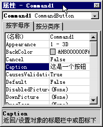 “组件属性窗口”:用来显示组件的属性,并允许我们修改,设定这些属性的值,我们在窗体设计区域的窗体上选中一个组件,以按钮为例,则在“属性窗口”中会列出它的属性,我们可以看到常用的“Name”、“Capition”、“Font”等等属性,试着把“Capition”属性改为“这是一个按钮”,然后看看“窗体设计区域”的按钮上显示的文字是不是改变了。