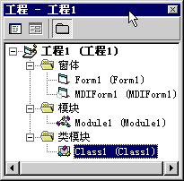 “VB工程管理器”:用来管理开发一个VB程序所需要的各种类型的窗体和模块,如左图是一个工程所包含的东西,窗体是一个程序表现在外面的界面、模块是程序内部使用的代码。 当我们点击“添加窗体”便捷工具按钮后,左图的“VB工程管理器”中就会显示出新添加的窗体,这也就是“VB工程管理器”的功能,它使我们从总体上把握程序开发的各个部分。