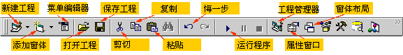窗体的最上层是“VB 6.0的菜单”和“便捷工具按钮”,菜单中包含了所有的VB提供的功能的选项,而其中一些常用的功能或操作选项则被提取出来放在了“便捷工具按钮”中,通过点击这些快捷按钮可以加快程序开发的速度,下图标出了常见的工具按钮的作用,记着使用它们哦。