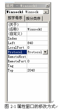 当已经选择好适当的协议之后,接下来,将必须要设置协议的类型。在Visable Basic之中,共有两种设置协议的方式:“修改属性窗口”以及“程序代码设置”。以下是这两种设置方式的说明。 ☺修改属性窗口(见图2-1)